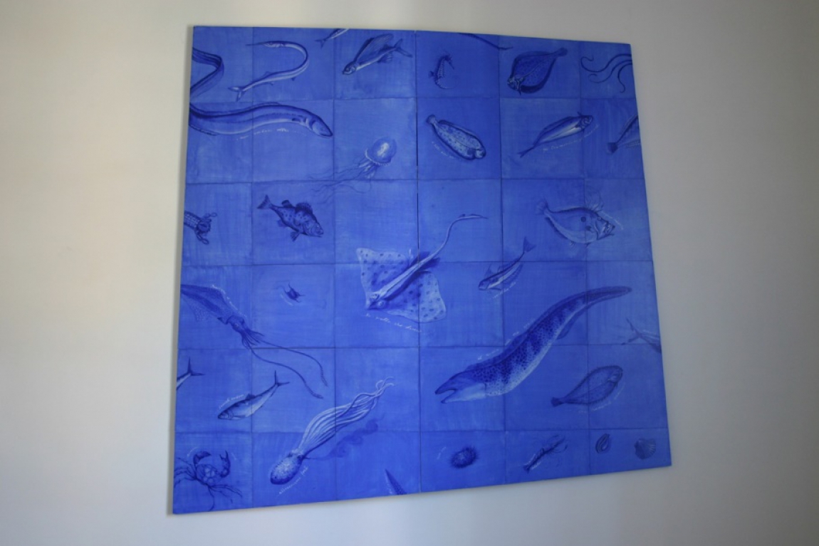 Così scrive delle opere in mostra la curatrice "Da anni Massimo Ruiu riflette sui molteplici e a volte controversi aspetti dell’immaginario legato al mare. Lo ha fatto con modi lievi ma al tempo stesso intrisi di commossa partecipazione – usando linguaggi diversi e soluzioni minimali in cui il non detto si è fatto protagonista eloquente – attraverso l’evocazione di drammatici fatti di cronaca, dal disastro aereo di Ustica (1980) all’affondamento nelle acque territoriali montenegrine – in circostanze mai completamente chiarite – del Francesco Padre (1994), un peschereccio della marineria molfettese, sino ai recenti e sempre più frequenti naufragi di migranti nel Mediterraneo. In alcuni dipinti con uno slittamento concettuale di indubbia intensità poetica, Ruiu dà la parola a chi ha trovato la morte in mare, a esseri umani incolpevoli, travolti da un tragico destino, come in Pensieri sommersi, in cui una sorta di testamento viene recitato sott’acqua da tante specie ittiche, mute per natura. Ogni pesce colma così il vuoto di un’assenza, facendosi custode silenzioso di un sospiro, di un rimpianto, di un addio, di un desiderio, di una domanda. Di un dolore incommensurabile e assurdo, sepolto nella profondità dell’abisso e cui noi dobbiamo rispetto, non solo pietà. In quest’occasione l’artista ha voluto inoltre intessere un dialogo diretto con il luogo. Così sui resti dei mosaici ritrovati nella villa di età romana (fine II sec.- primi decenni I sec. a.C.), situata sulla costa molese in località Padovano, e oggi collocati nel castello, ha deciso di proiettare impalpabili forme di luce, pesci virtuali in luogo di quelli reali, che oggi probabilmente, a seguito dell’azione di erosione dell’avanzamento del mare verso la terraferma, potrebbero nuotare negli ambienti dell’antico edificio, sfigurato dal tempo e dall’azione degli uomini. Riunendo, così, in un unico affascinante palinsesto, passato e presente, storia e poesia."